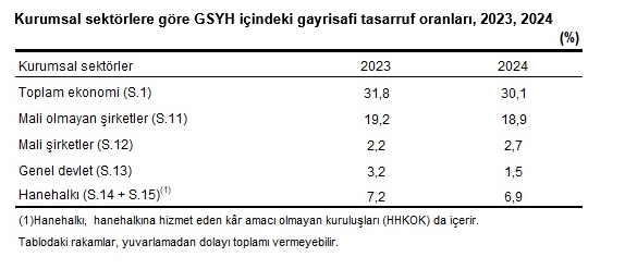 Toplam gayrisafi tasarrufun GSYH'ye oranı 2024 yılında toplam ekonomi için yüzde 30,1 oldu. Bu oran mali olmayan şirketler için yüzde 18,9 hanehalkı için yüzde 6,9 mali şirketler için yüzde 2,7 ve genel devlet için yüzde 1,5 oldu.