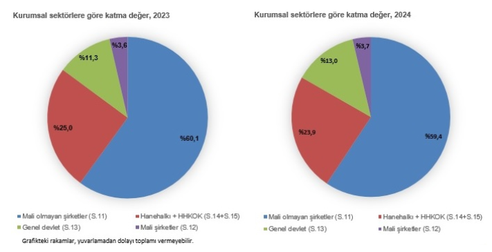 Mali olmayan şirketler, toplam ekonomide yaratılan katma değere en fazla katkıyı yapan sektör oldu. Mali olmayan şirketlerin toplam katma değer içindeki payı 2024 yılında yüzde 59,4 olarak gerçekleşti. Bu sektörü sırasıyla hanehalkı ve hanehalkına hizmet veren kar amacı olmayan kuruluşlar (HHKOK) ile genel devlet takip etti.