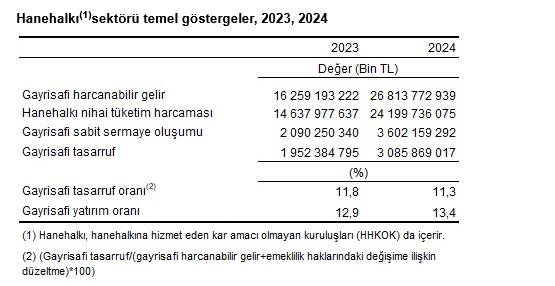 Hanehalkı tasarrufunun harcanabilir gelire oranı olarak tanımlanan tasarruf oranı, 2023 yılında yüzde 11,8 iken 2024 yılında yüzde 11,3 oldu.