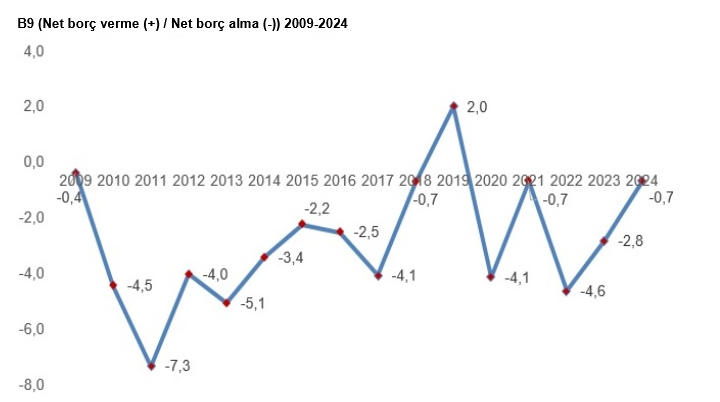 Toplam ekonomi 2023 yılında GSYH'nin yüzde 2,8 ile net borç alan pozisyondayken, 2024 yılında yüzde 0,7 ile net borç alan pozisyonda oldu.