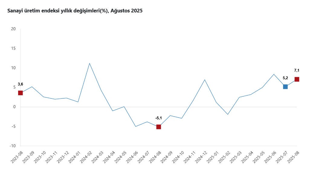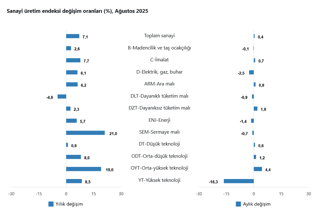 Türkiye İstatistik Kurumu (TÜİK) verilerine göre, sanayinin alt sektörleri (2021=100 referans yıllı) incelendiğinde, 2025 yılı Ağustos ayında madencilik ve taş ocakçılığı sektörü endeksi bir önceki yılın aynı ayına göre yüzde 2,6 arttı, imalat sanayi sektörü endeksi yüzde 7,7 arttı ve elektrik, gaz, buhar ve iklimlendirme üretimi ve dağıtımı sektörü endeksi yüzde 6,1 arttı.