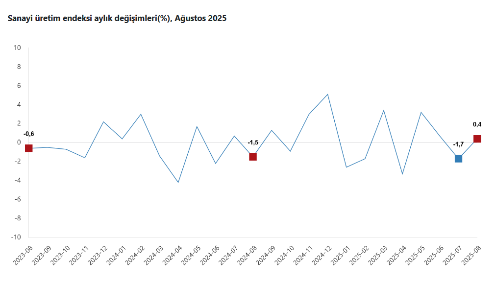 Sanayinin alt sektörleri incelendiğinde, 2025 yılı Ağustos ayında madencilik ve taş ocakçılığı sektörü endeksi bir önceki aya göre yüzde 0,1 azaldı, imalat sanayi sektörü endeksi yüzde 0,7 arttı ve elektrik, gaz, buhar ve iklimlendirme üretimi ve dağıtımı sektörü endeksi yüzde 2,5 azaldı.